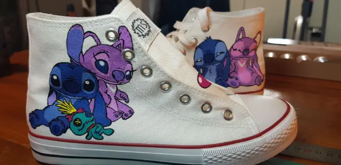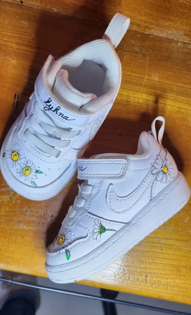 La personnalisation est réalisée avec des peintures spécialement conçues pour le textile et le cuir . Cela permet à la chaussure personnalisée de conserver sa qualité et sa résistance dans le temps.
